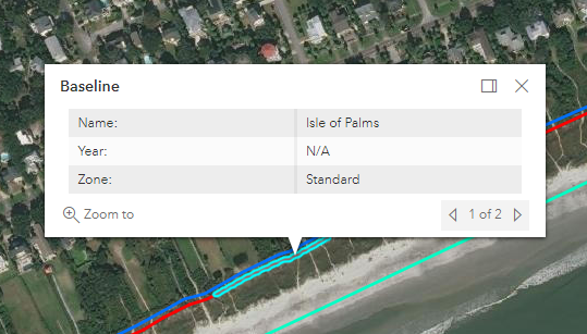 The "popup" window is "on" by default when zoomed into a beach area. The "popup" window is used to display important fields or information about a selected feature. Simply click a map feature (pointer cursor